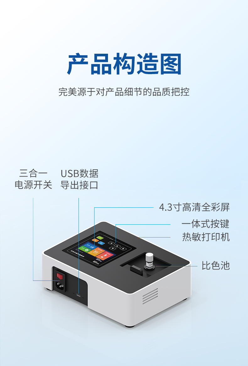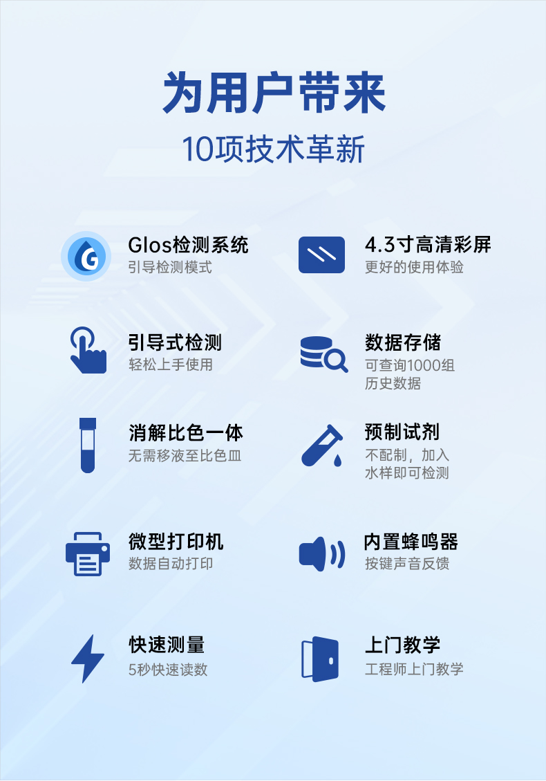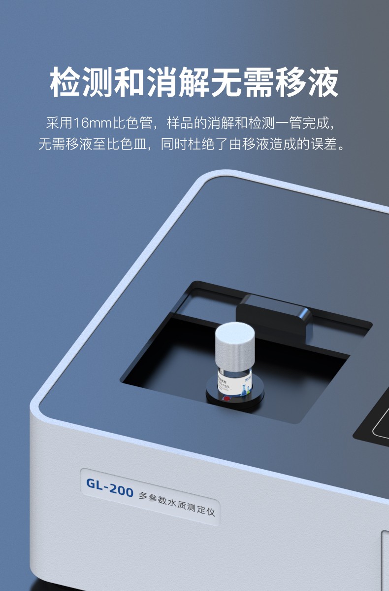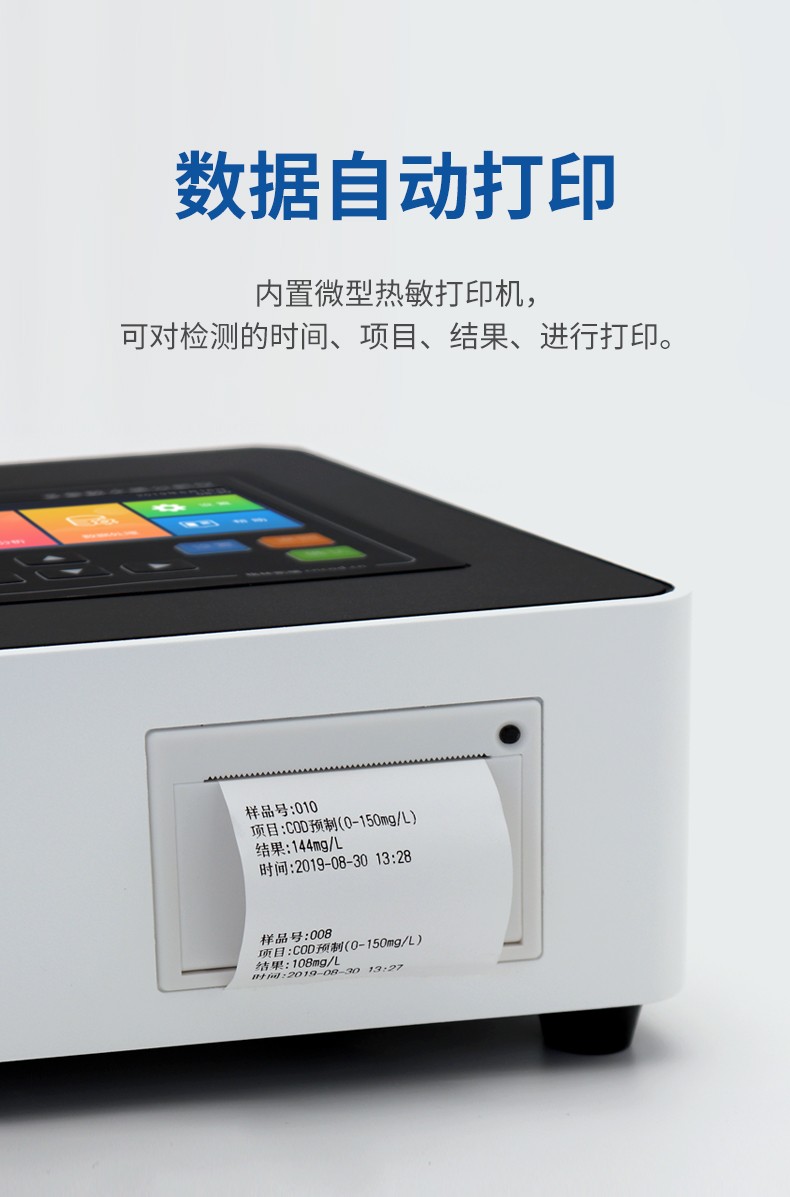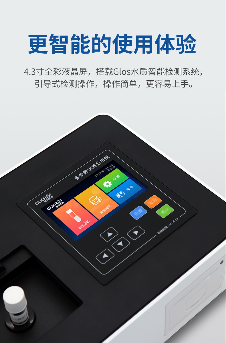 測定項目的原理符合環保行業認可方法。比色方式采用管比色,無需移液至比色皿便能快速測定水質中 COD、氨氮、總磷、總氮的濃度,內置微型熱敏打印機,檢測完畢即可打印數據,測試數據可通過U盤導出。設備搭載“Glos?質智能檢測系統”讓檢測變得簡單智能。