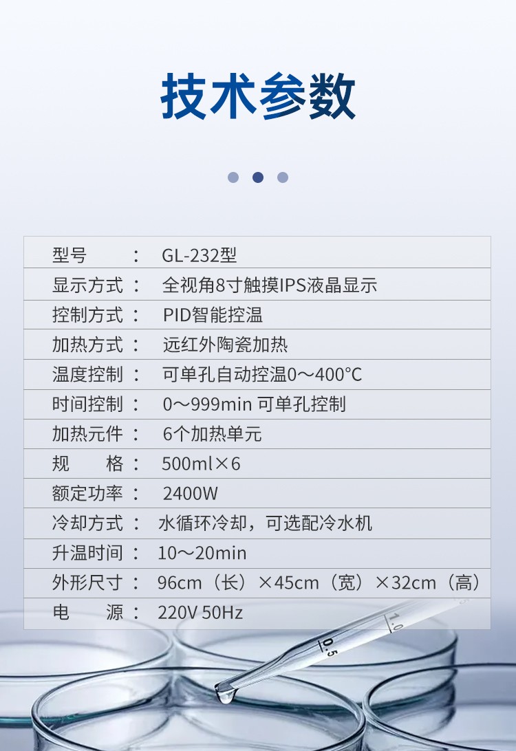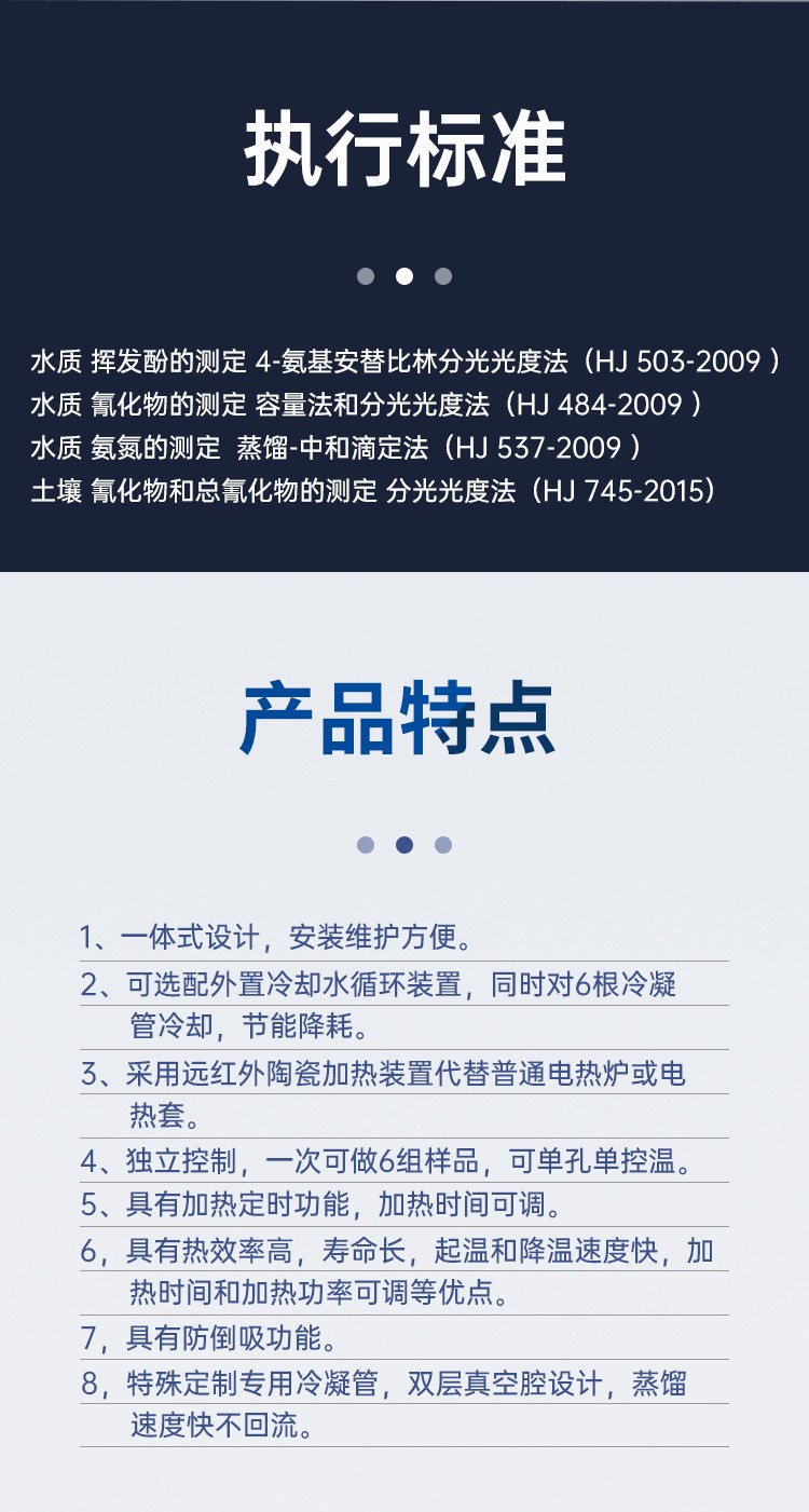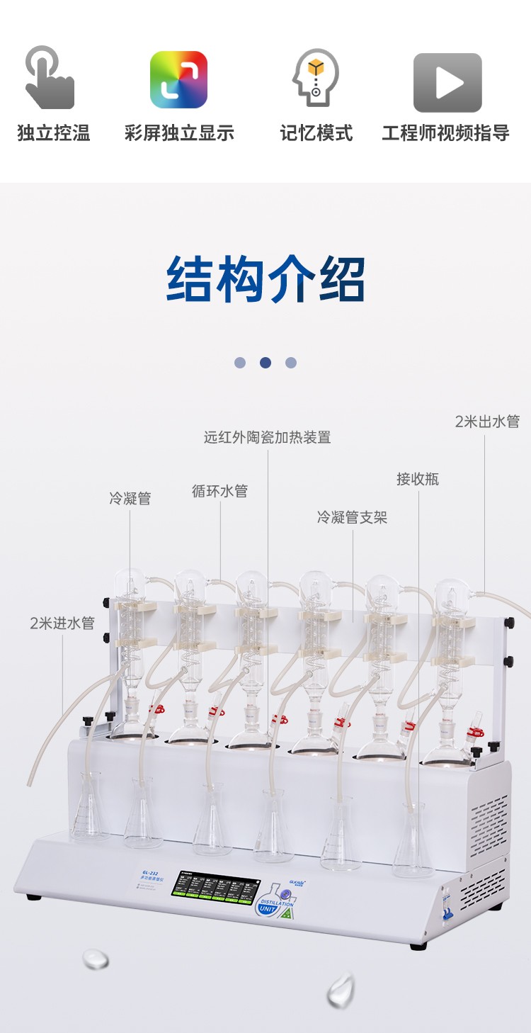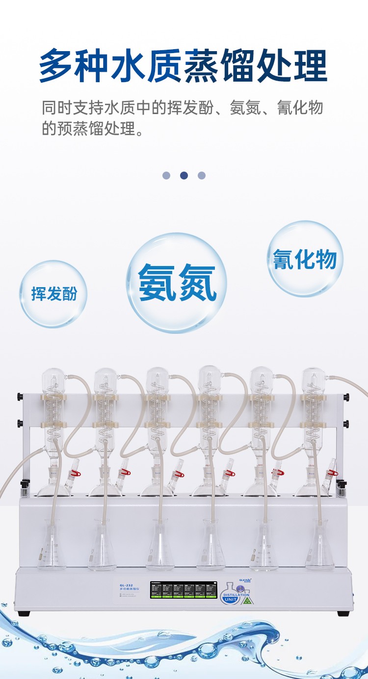 多功能蒸餾儀同時(shí)采用智能控溫、智能數(shù)字定時(shí)、自來(lái)水循環(huán)冷卻等技術(shù)手段,實(shí)現(xiàn)了美觀實(shí)用、節(jié)能環(huán)保等目的,可廣泛適用于檢測(cè)領(lǐng)域,如揮發(fā)酚、氰化物、氨氮、凱氏氮、油中水份等項(xiàng)目的蒸餾處理。