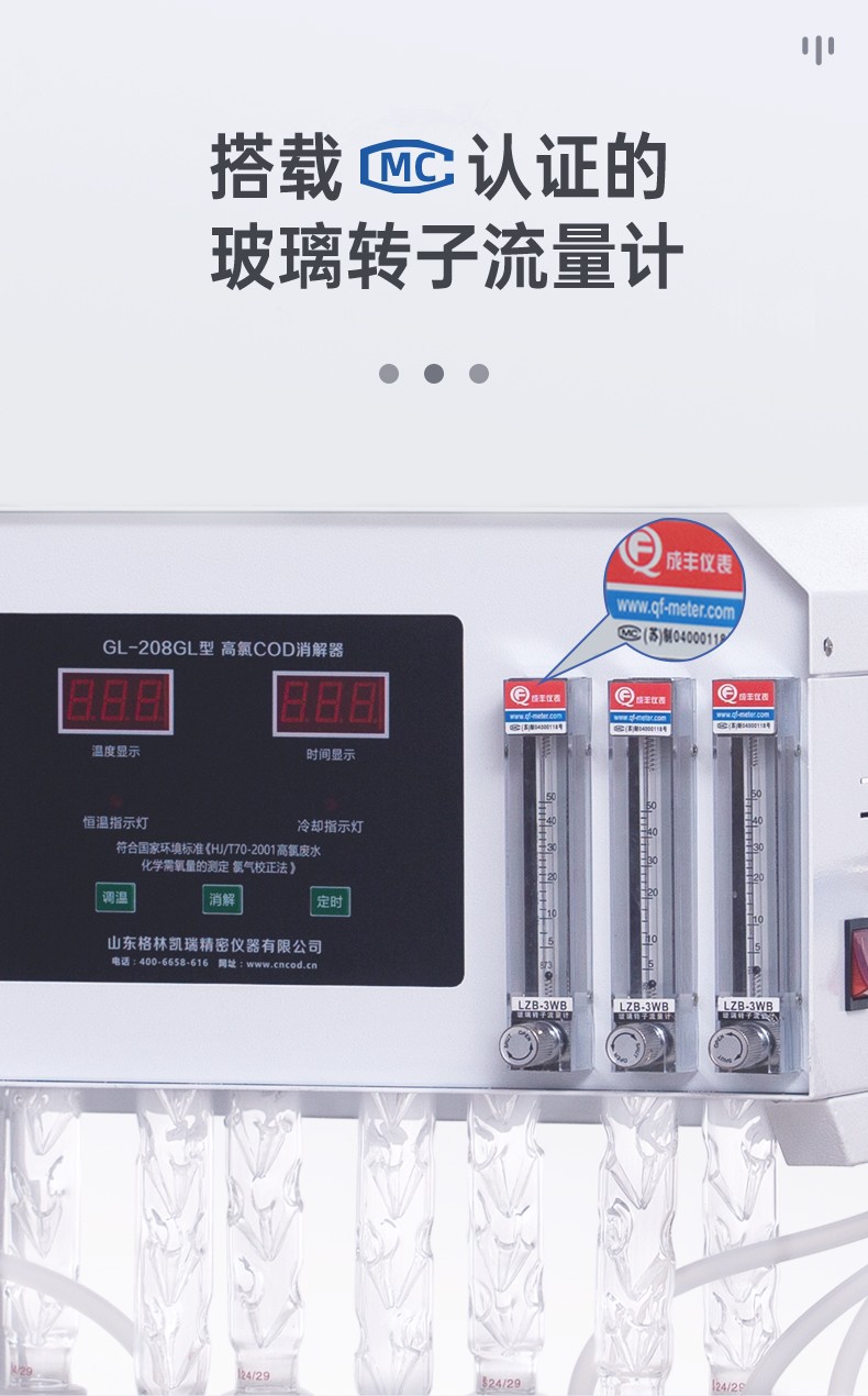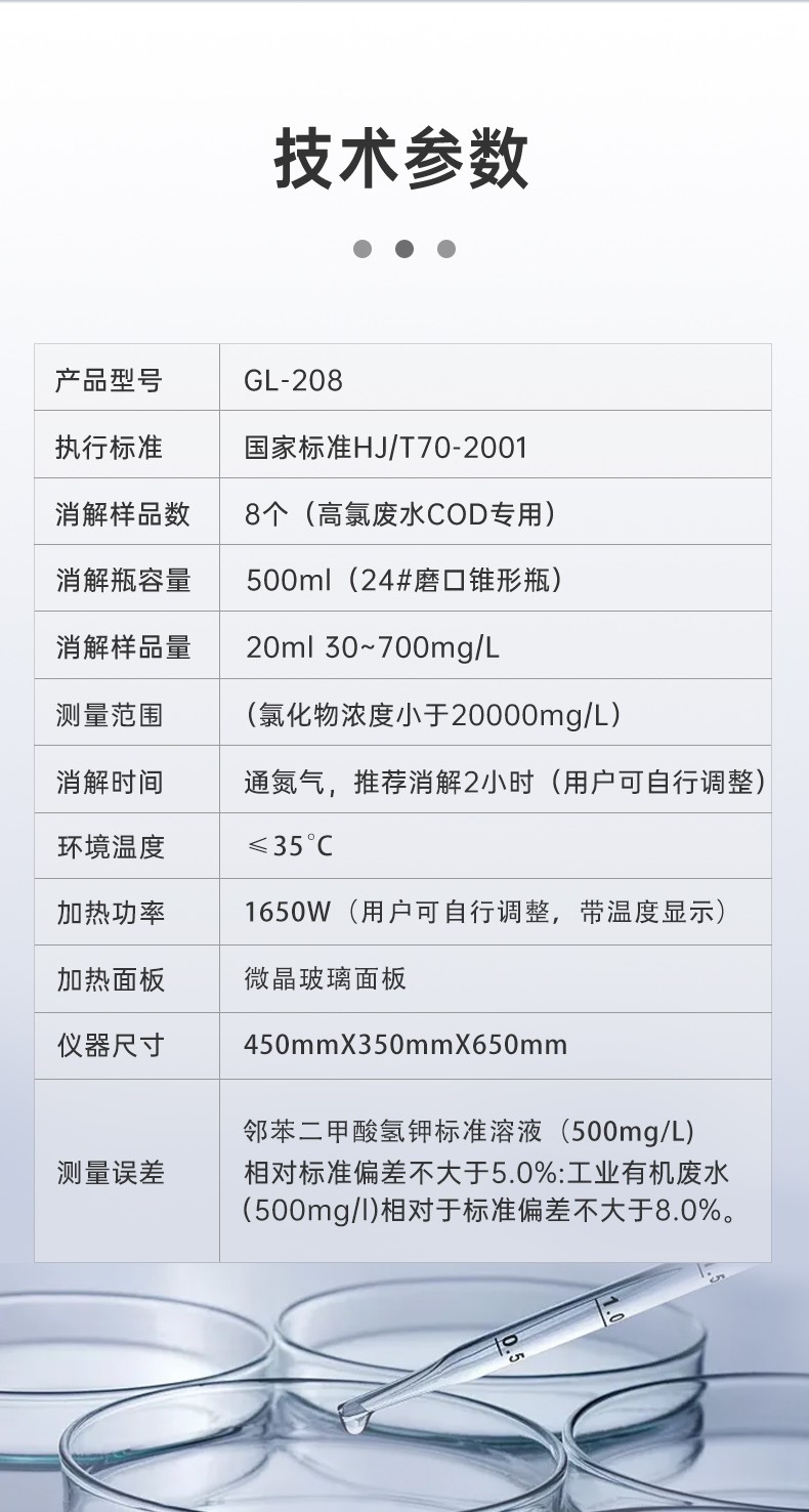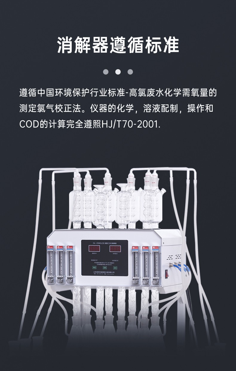 高氯COD消解器遵循國家標準:高氯廢水化學需氧量的測定氯氣校正法,儀器的化學溶液配制、操作和COD的計算遵照 HJ/T70-2001,適用于氯離子含量小于20000mg/L的高氯廢水中COD的測定。