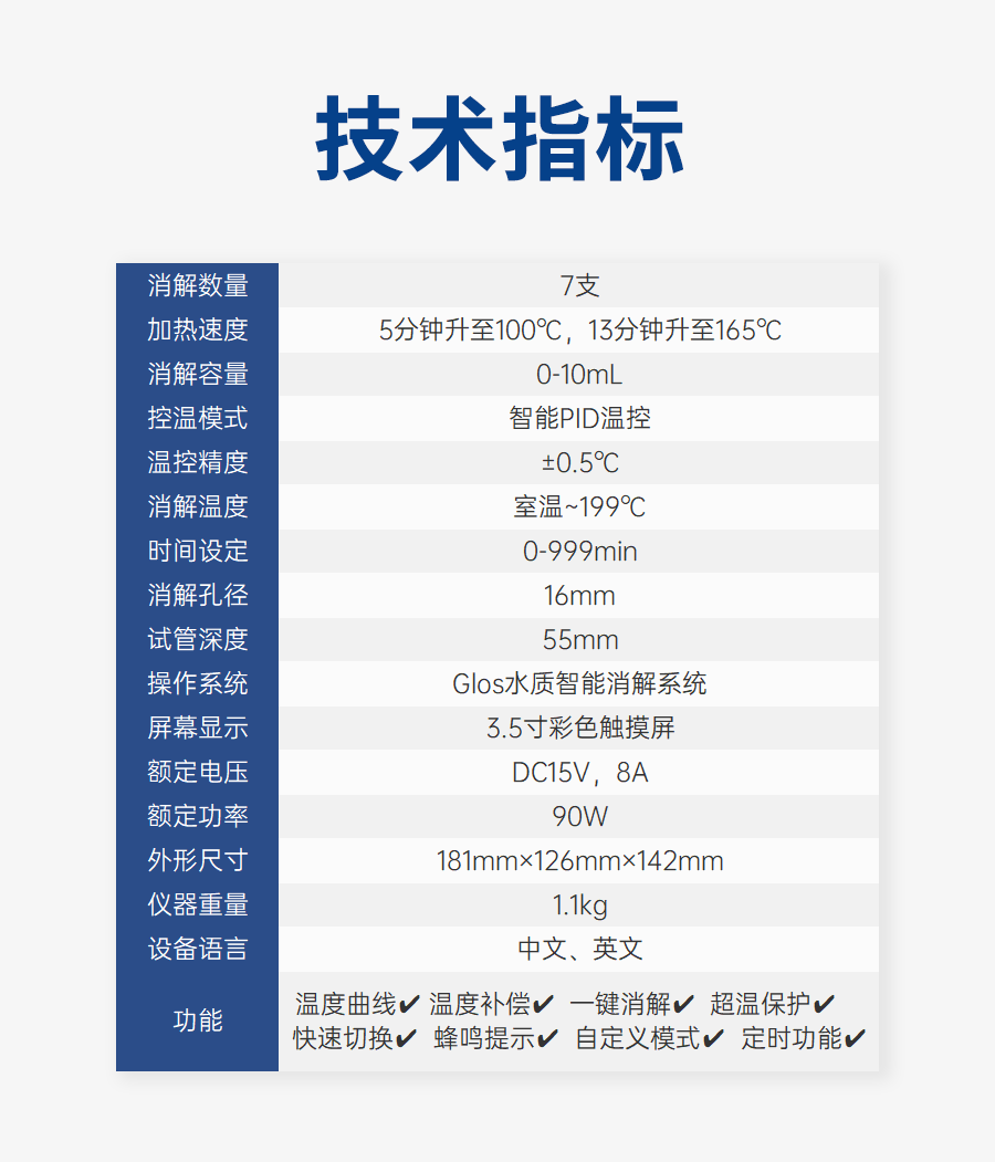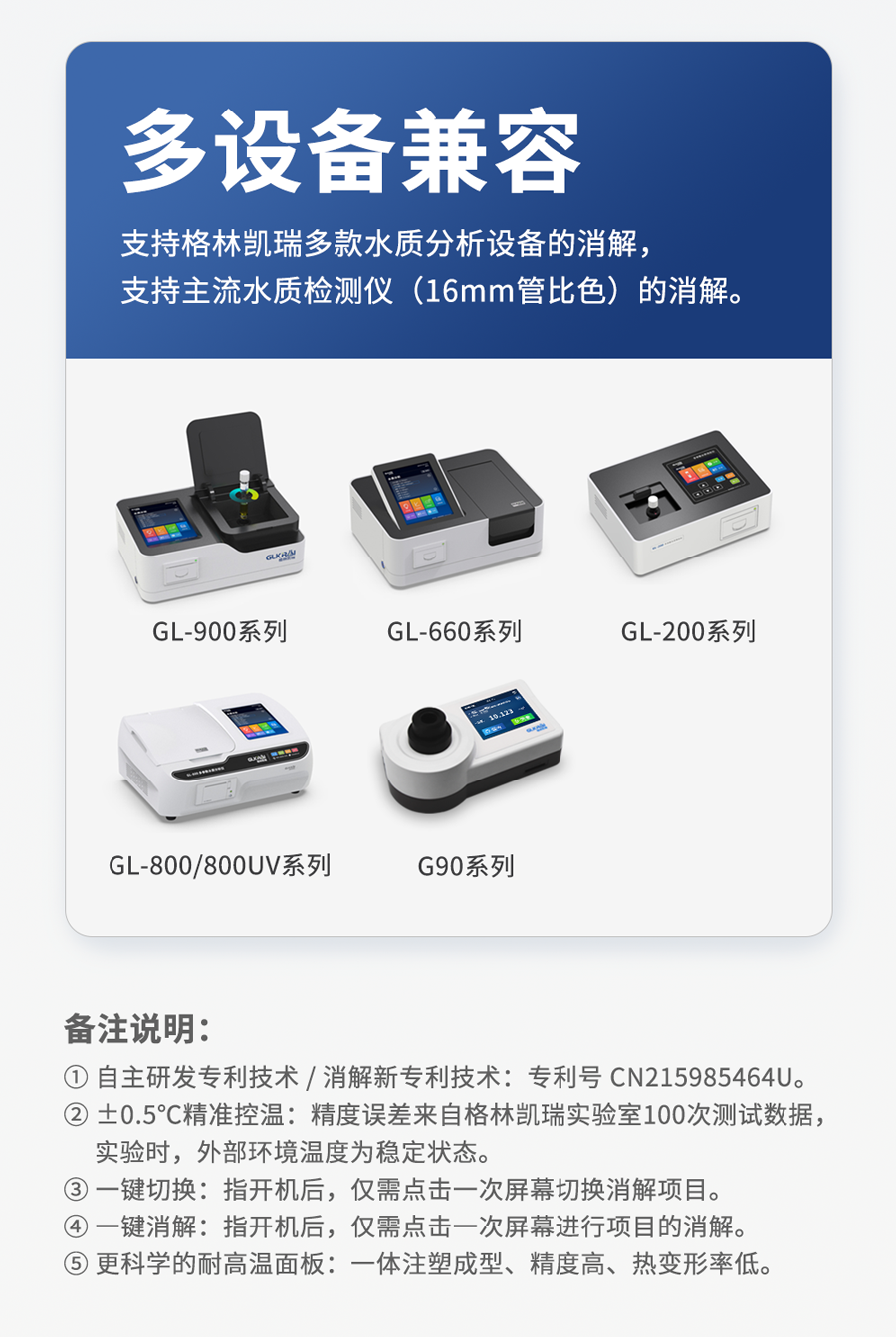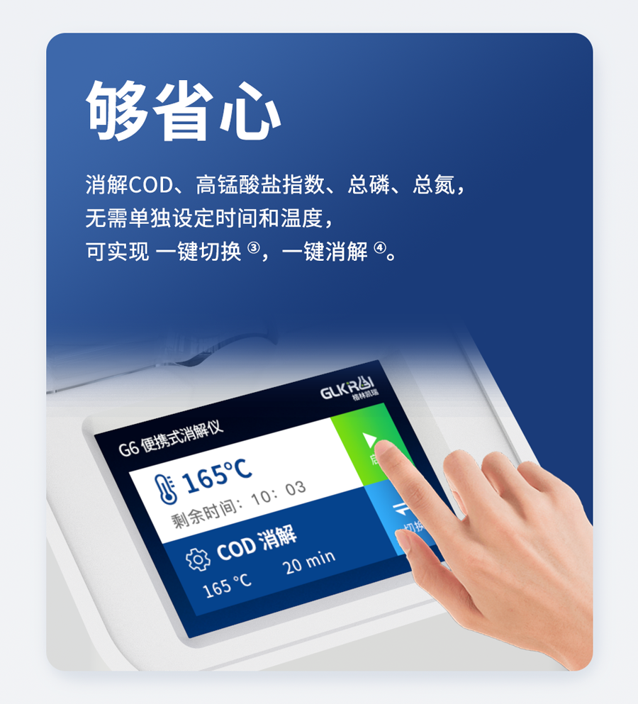 G7型智能消解儀是一款7孔消解設備,搭載Glos智能消解系統,3.5寸電容觸屏操作,可對多種檢測參數如:COD、總磷、總氮、總鉻檢測等項目進行一鍵消解,可根據客戶需求提供大容量鋰電池包,方便野外操作。