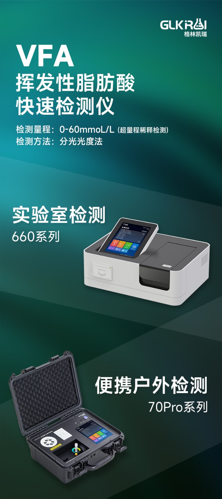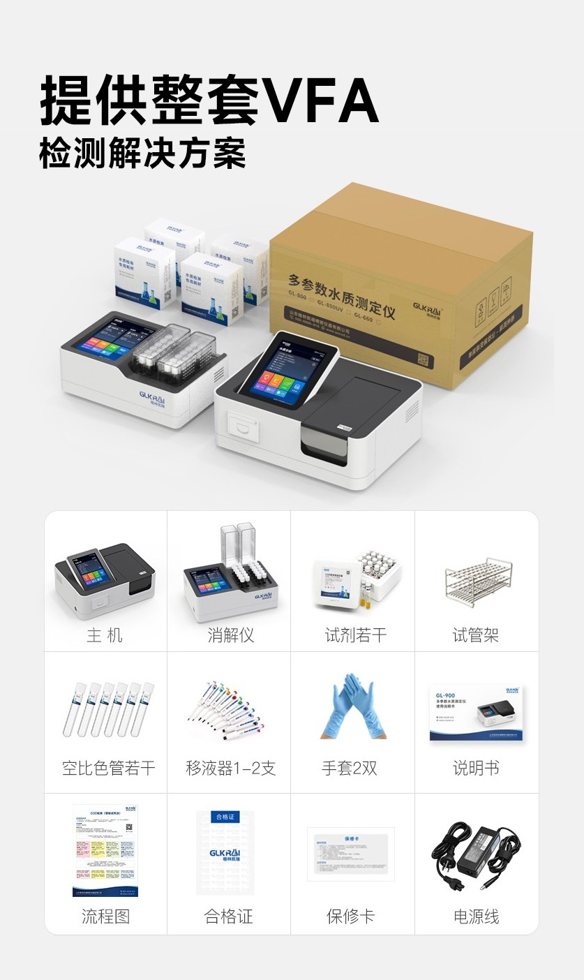 GL-660系列 VFA測定儀,測定項目的原理符合環保行業認可方法,設備的光源、傳感器為國外進口,擁有更穩定的光學性能,設備搭載 自主研發的Glos水質智能檢測系統和一體式雙比色池技術,使檢測變得更簡單,更穩定。檢測結果支持自動打印、具備批量檢測、引導 檢測模式等功能。