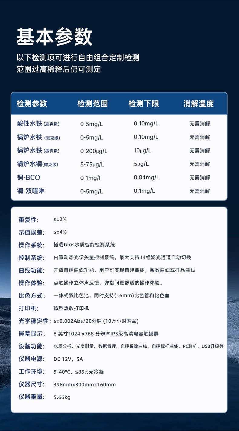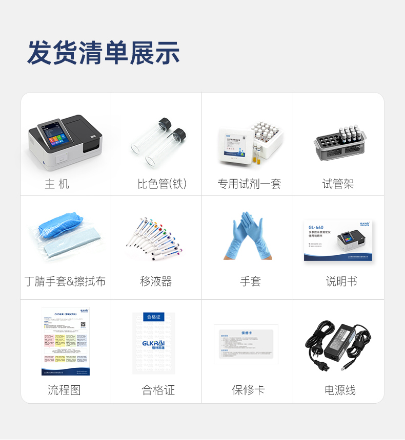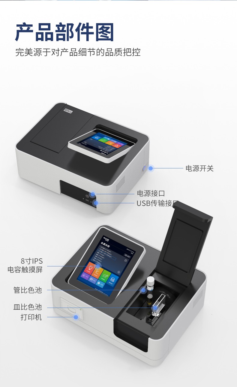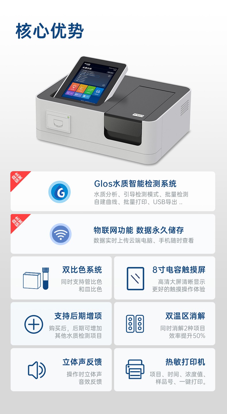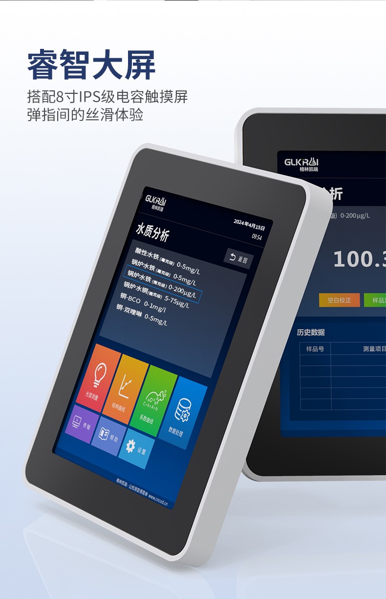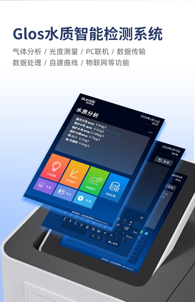 測定項目的原理符合環保行業認可方法,設備的光源、傳感器為國外進口,擁有更穩定的光學性能,設備搭載自主研發的Glos水質智能檢測系統和一體式雙比色池技術,使檢測變得更簡單,更穩定。